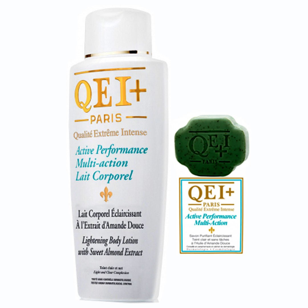 The QEI Active Performance Multi Action (Lotion And Soap) Pack of 3 is an essential whitening duo designed for individuals who seek significant results on hyperpigmentation while maintaining a soft, healthy skin texture. This set includes the 500ml Performance Toning Milk and the clarifying Exfoliating Soap. Formulated with a potent blend of Sweet Almond Oil and active botanical brightening agents, it targets melanin production aggressively across the entire body.