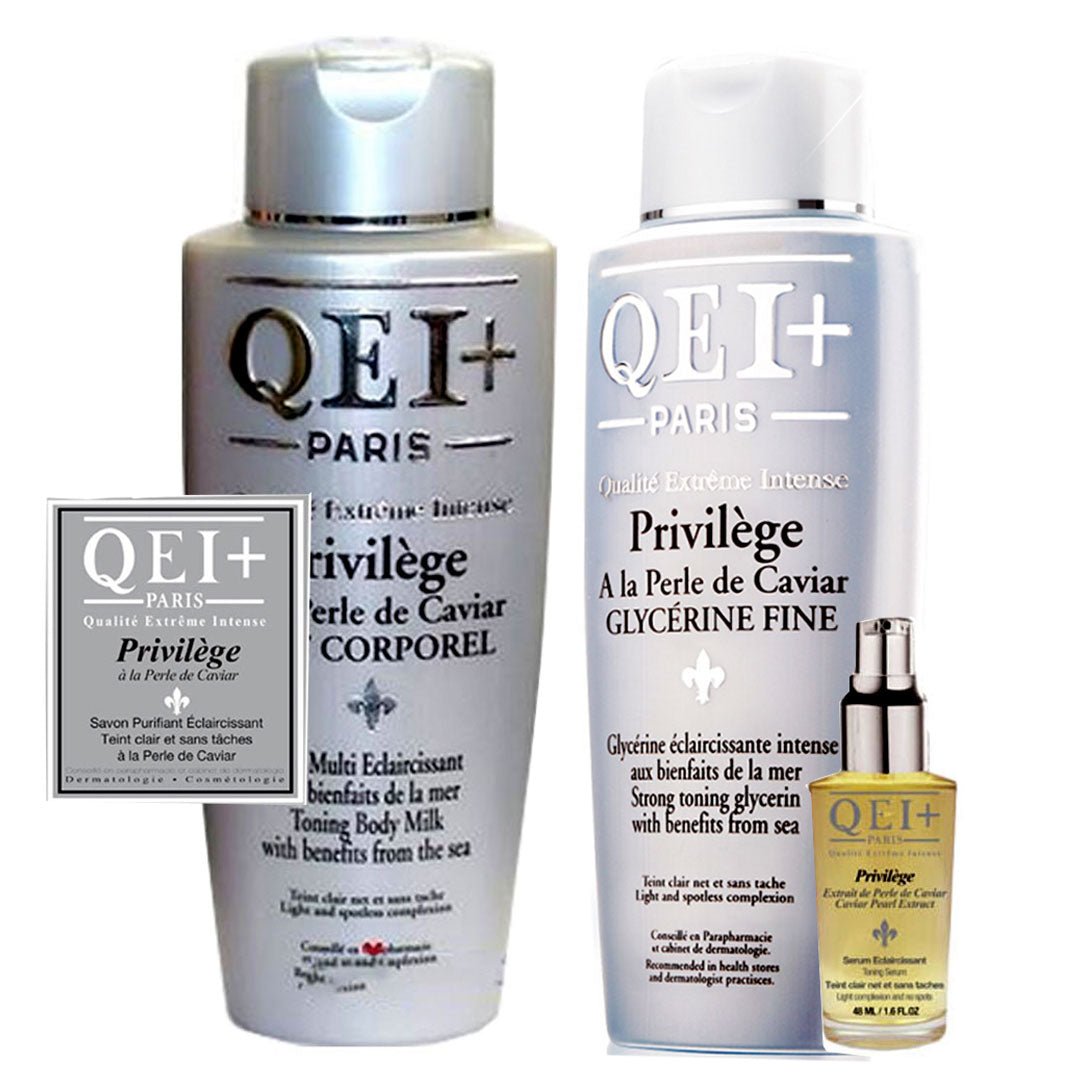 The Qei Paris Privilege Lightening Pack of 3 is a high-performance beauty system designed for individuals seeking significant results and a luxurious experience. This set includes the Privilege Body Lotion, the concentrated Serum booster, the hydrating Glycerine, and the clarifying Soap. Formulated with Caviar Extract and active botanical whitening agents, it targets hyperpigmentation while providing anti-aging benefits.