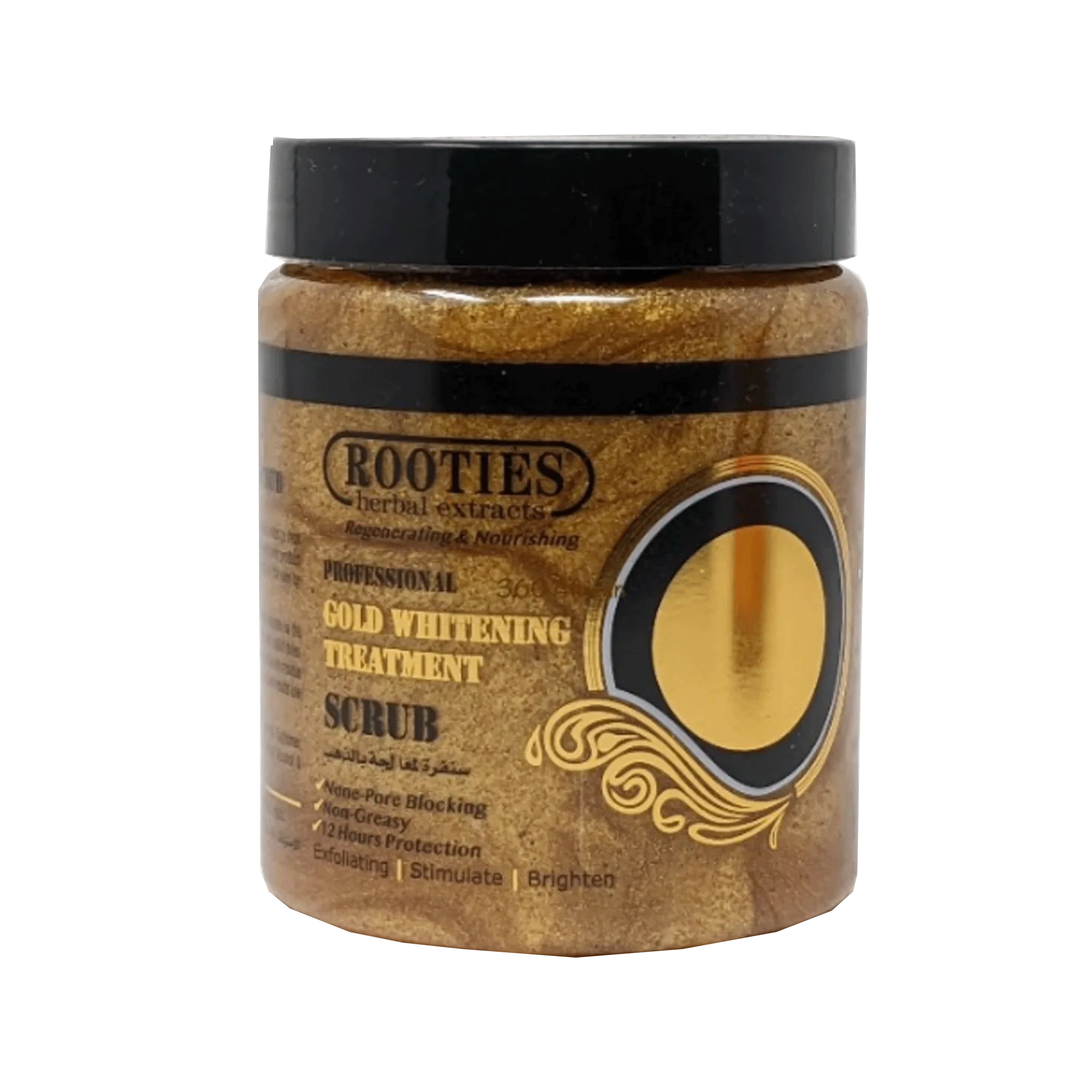 + Delivery in 24 Hours!Rooties – Gold Whitening Scrub – 1000ml is the 1000ml whitening body scrub with Gold particles that removes dead skin cells and brightens dark areas for a smooth, shimmering finish.