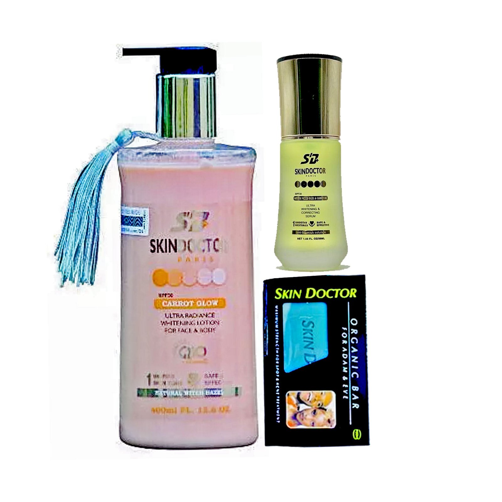 + Delivery in 24 Hours!Skin Doctor Carrot Glow ( Lotion, Serum And Soap ) Pack of 3 is the 3-piece whitening set with Carrot Oil that inhibits melanin and repairs skin for a fair, radiant, and unified body tone.
