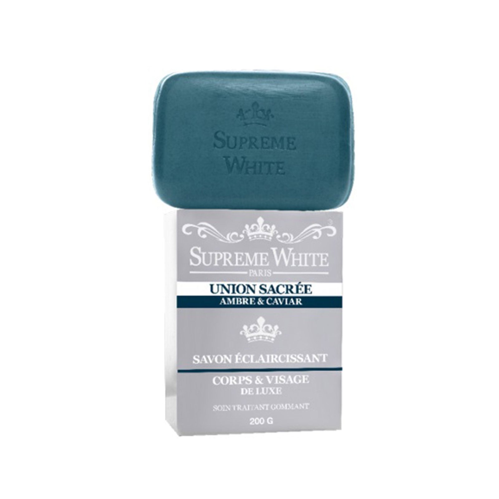 Supreme White Union Sacree Exfoliating Soap Lightening Amber and Caviar is a luxurious and effective treatment for achieving a smooth and luminous body. This specialized “Gommant” soap combines the physical exfoliation of natural particles with the intensive nourishment of amber and caviar extracts. The exfoliating action helps to buff away dead skin cells and impurities, smoothing out rough texture and unclogging pores, while the luxury extracts work to rejuvenate the skin and provide a radiant finish.
