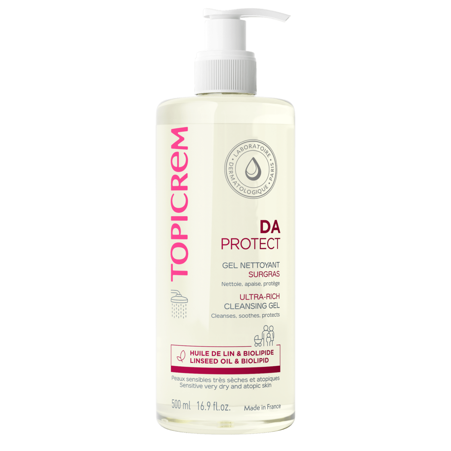 Topicrem DA Ultra Rich Cleansing Gel 500ml is a high-tolerance daily wash designed for infants, children, and adults with sensitive and very dry skin. The benefit of this “Ultra Rich” gel is its soap-free cleansing base that effectively removes dirt and sweat while maintaining the skin’s natural moisture balance. It is formulated with moisturizing agents like Glycerin to prevent the tight and dry feeling often associated with traditional shower gels.