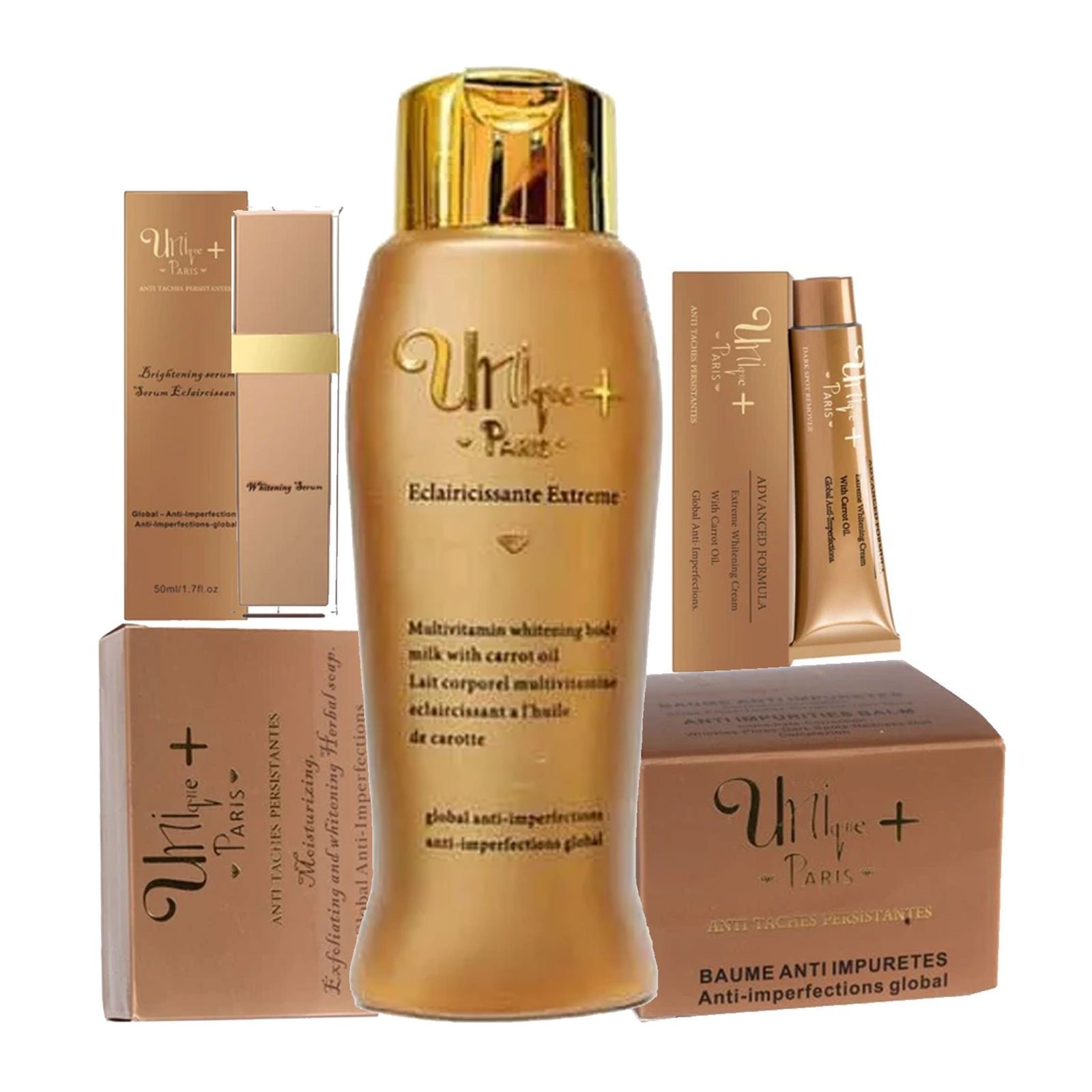 + Delivery in 24 Hours!Unique+ Paris Pack of 5 ( Lotion, Serum, Tube Cream, Anti Impurity Balm And Soap ) – The ultimate 5-piece luxury set with soap, lotion, serum, tube cream, and anti-impurity balm for complete skin brightening, purification, and repair.