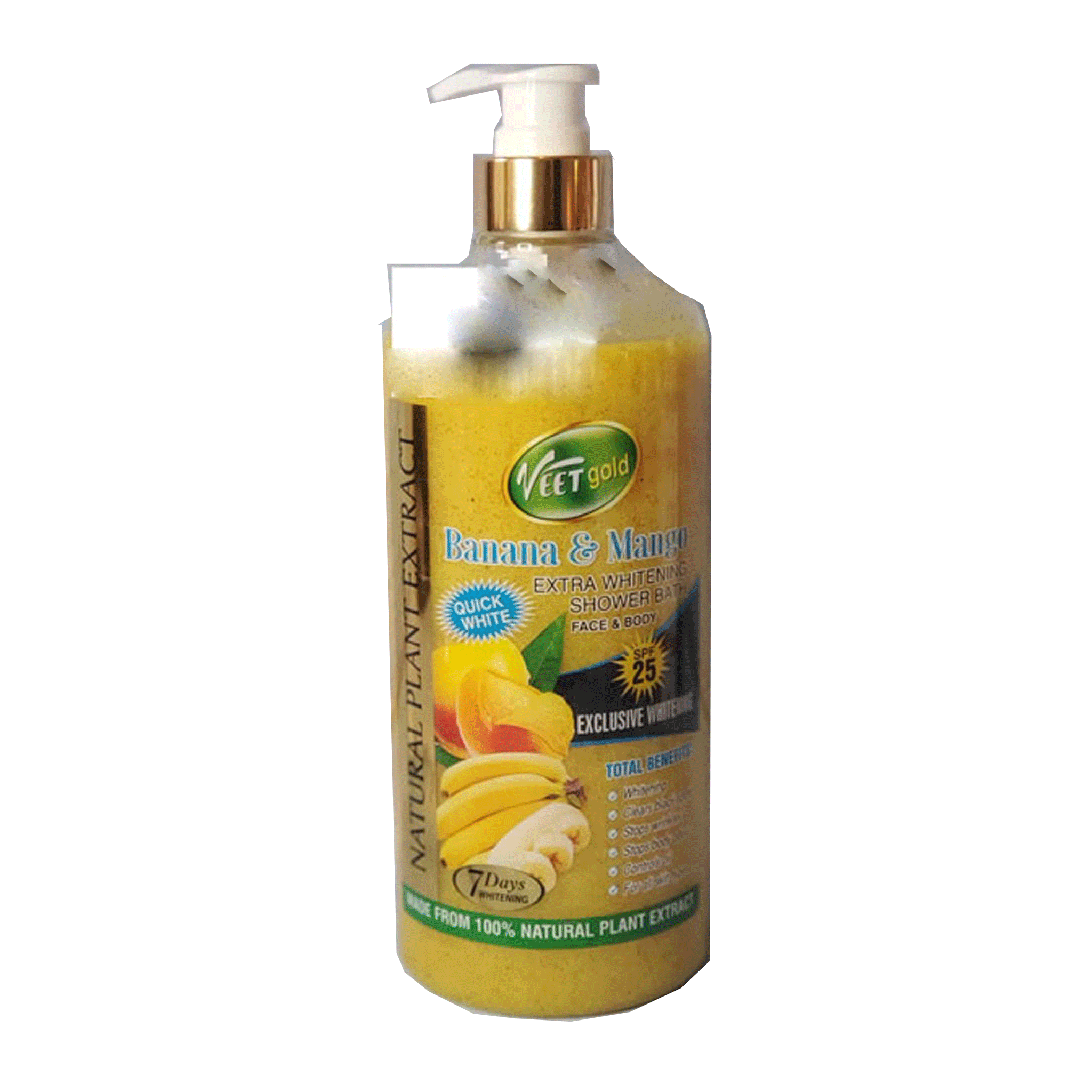 Veetgold Banana & Mango Extra Whitening Shower Bath 1000ml is a high-performance whitening cleanser designed for individuals who desire a professional-grade skin brightening result. This massive 1000ml bottle features an intensive formula enriched with natural Banana and Mango extracts, providing a high concentration of vitamins and enzymes that gently exfoliate and nourish the skin.
