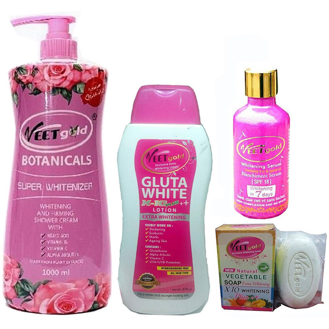 + Delivery in 24 Hours!The complete 4-piece whitening set from Veetgold featuring lotion, serum, soap, and wash for intensive body brightening.