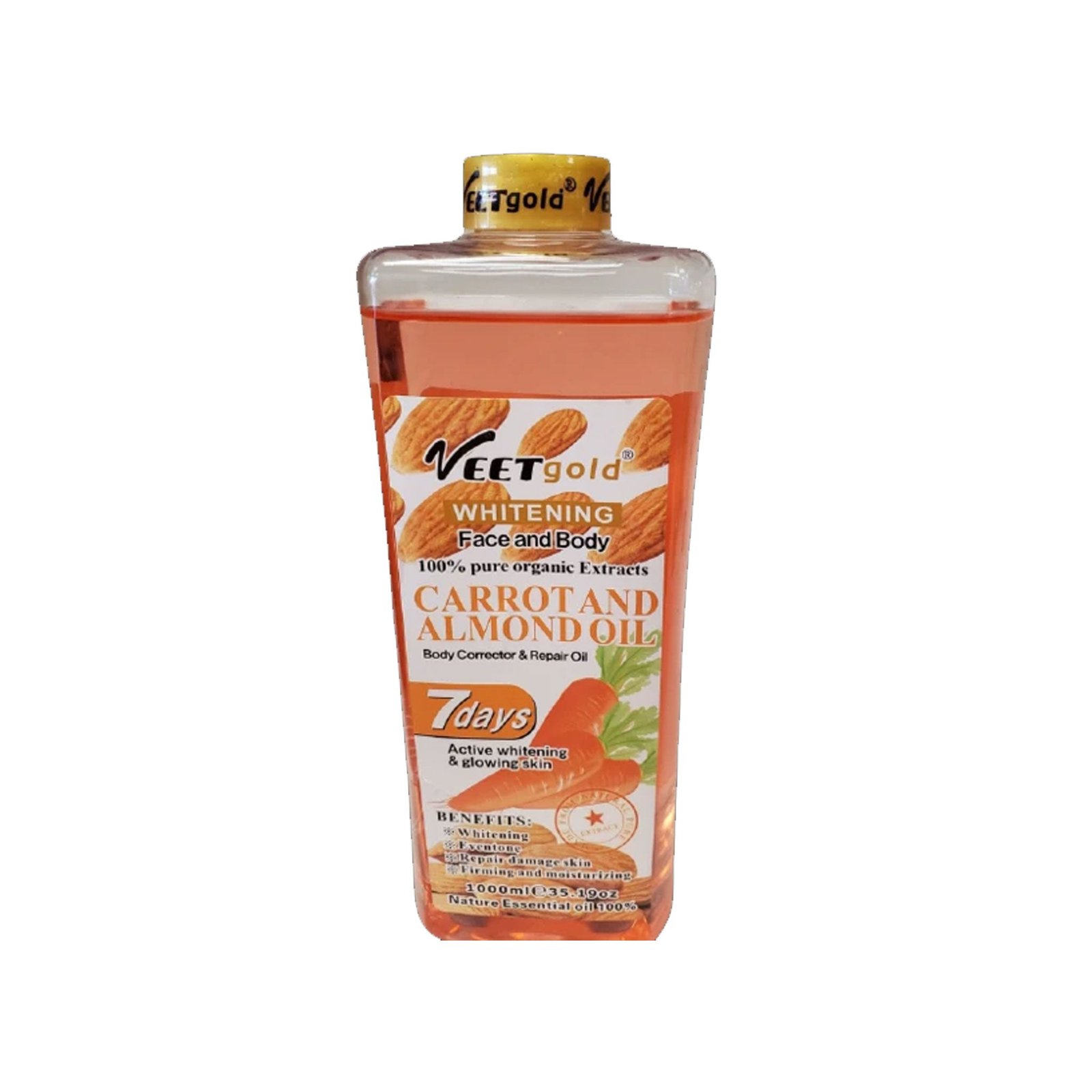 VEETGOLD WHITENING FACE AND BODY CARROT AND ALMOND OIL is a luxurious and nutrient-rich treatment designed to provide an instant boost in skin softness and luminosity. This premium oil features a potent blend of high-quality Carrot oil and Sweet Almond oil, providing a high concentration of vitamins A and E to rejuvenate the skin and promote a healthy brilliance across both the face and body.