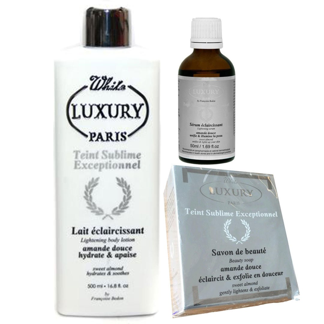 + Delivery in 24 Hours!The complete 3-piece whitening set from White Luxury featuring lotion, serum, and soap for intensive body brightening.