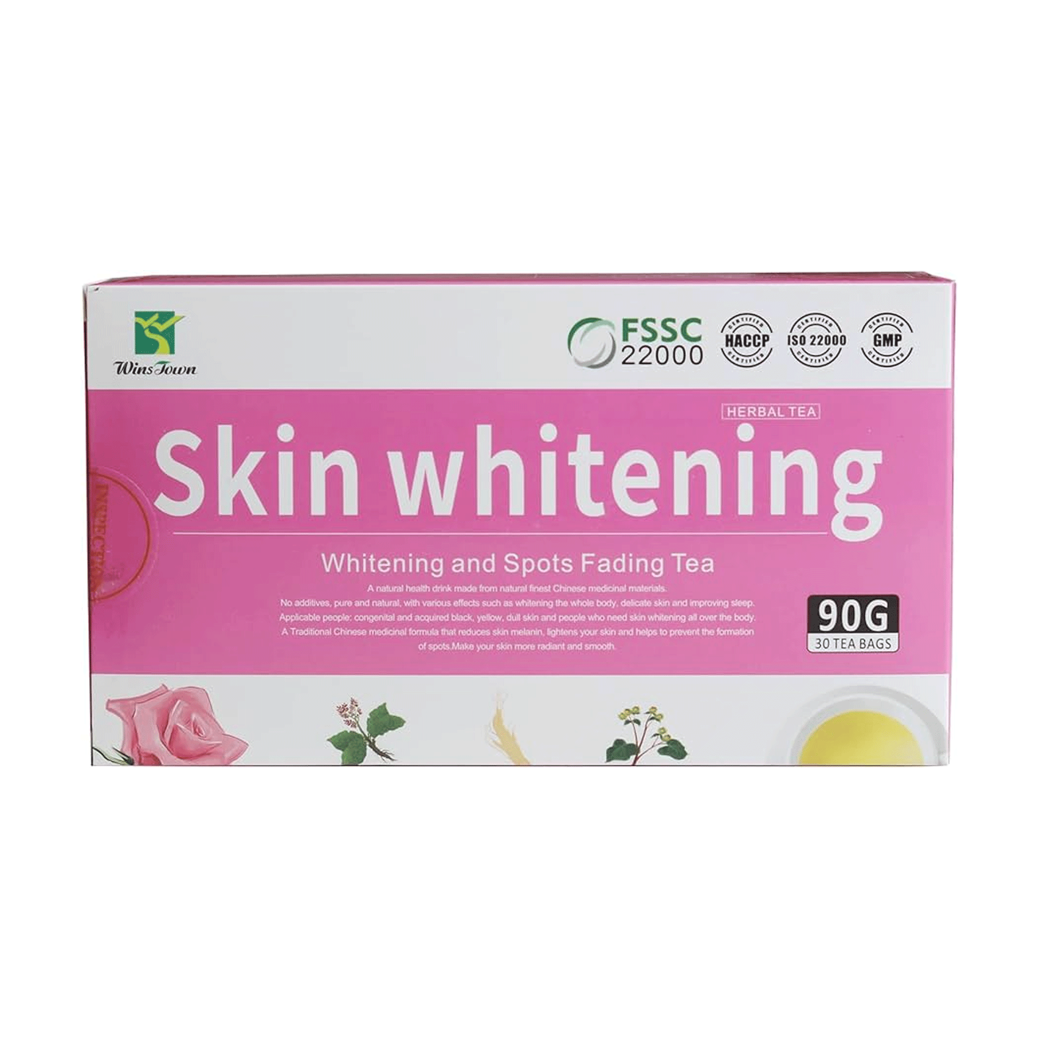 Wins Town Skin Whitening and Spots Fading Tea, 30 Tea bags is a functional tea blend designed to support skin clarity. It typically contains ingredients that support liver function and detoxification, such as dandelion or licorice, as a healthy liver is key to clear skin. It aims to reduce internal toxins that contribute to dark spots and dullness.