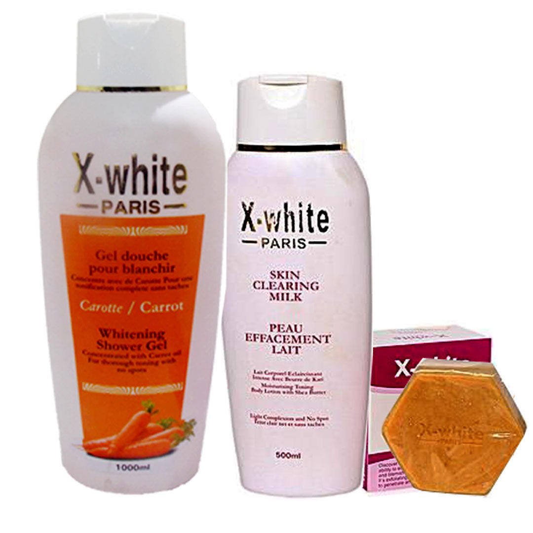 The X White Skin Clearing Milk (Skin Clearing Milk, Shower Gel And Soap) Pack of 3 is a comprehensive skin-toning system designed for individuals who desire a complete and professional-grade solution for a clear and uniform complexion. This curated set includes the high-potency Skin Clearing Milk, the rejuvenating Shower Gel, and the purifying Bar Soap.